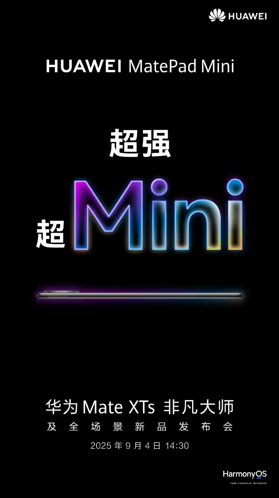 华为近期官宣将于9月4日下午举办华为Mate XTs非凡大师发布会,此次发布会亮点十足正规炒股配资官网,不仅将推出新一代三折叠屏手机,一款备受关注的小屏平板——华为MatePad Mini也将正式亮相。