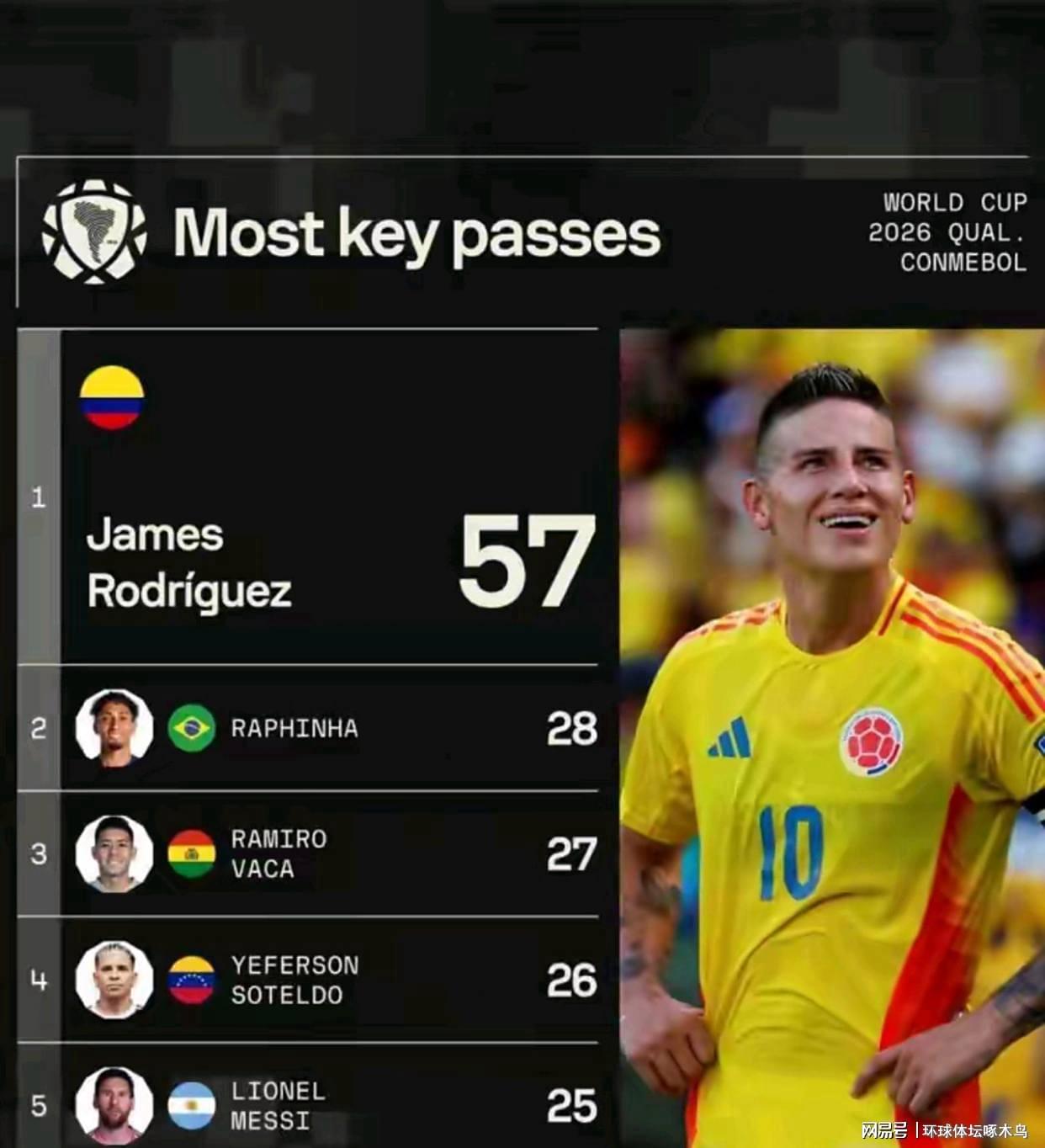 在南美区世界杯预选赛结束后,著名数据网站Sofascore公布了本届赛事的关键传球次数排行榜。哥伦比亚中场核心哈梅斯·罗德里格斯以57次关键传球高居榜首,成为本届世预赛中创造机会能力最突出的球员。