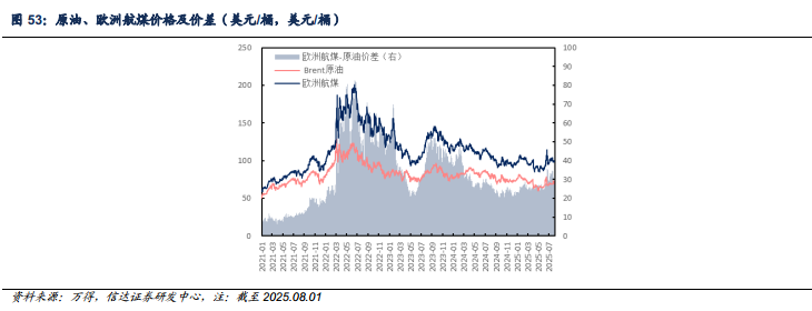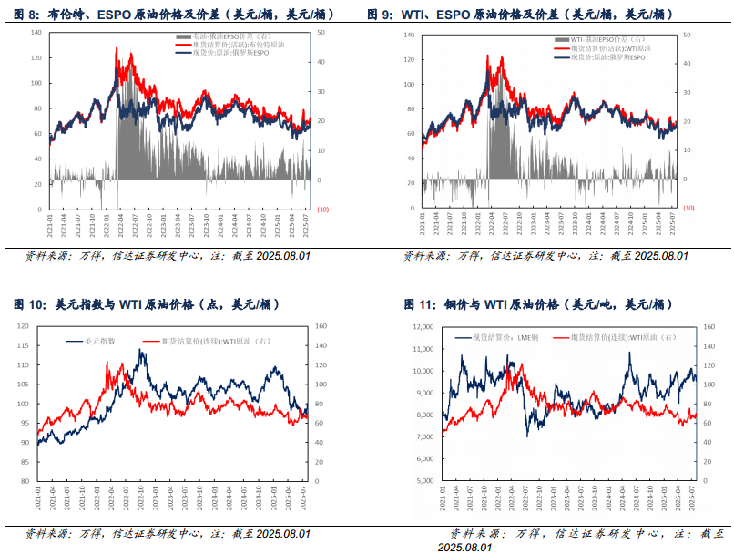 截至2025年8月1日当周,油价整体走高。本周,美欧达成贸易协议,叠加特朗普将缩短俄乌达成和平协议的最后期限,且美国可能施压二级制裁,并对俄油买家发出关税威胁,市场担忧供应收紧,油价整体走高。截至本周五(8月1日),布伦特、WTI油价分别为69.67、67.33美元/桶。