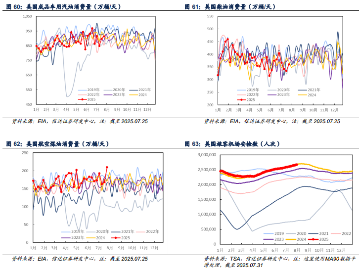 消费方面:截至2025年07月25日当周,美国成品车用汽油、柴油、航空煤油消费量分别为915.2、360.5、209.3万桶/天,较上周分别+18.5(+2.06%)、+26.2(+7.84%)、+41.1(+24.44%)万桶/天。