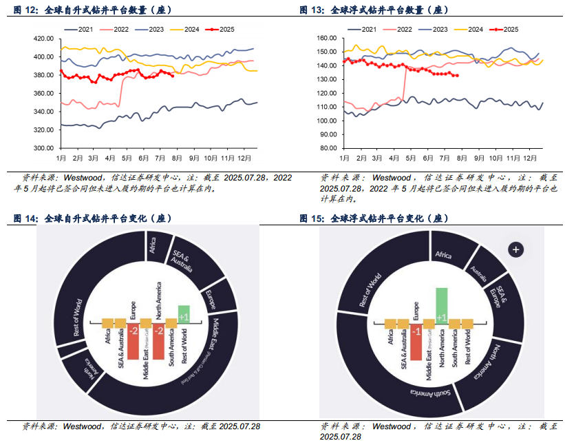 已有合同的钻井平台数量:截至2025年7月28日当周,全球海上自升式钻井平台数量为379座,较上周减少3座,其中欧洲、北美各减少2座,其他地区增加1座;全球海上浮式钻井平台数量为133座,较上周持平,其中欧洲减少1座,北美增加1座。