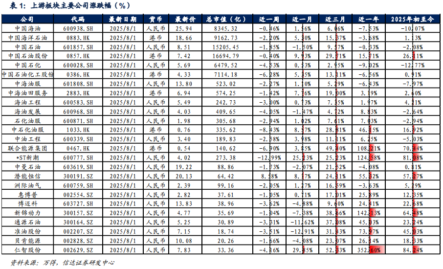 截至2025年8月1日当周,上游板块股价表现较好的仁智股份(维权)(+8.58%),其他均出现不同程度下跌。