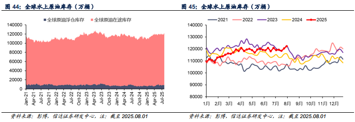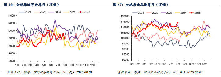 截至2025年8月1日当周,全球原油水上库存(包括在途和浮仓)为12.23亿桶,较上周+1825.2万桶(+1.49%)。其中,全球原油浮仓库存为8020.4万桶,较上周-1274.8万桶(-15.89%);全球原油在途库存为11.43亿桶,较上周+3100万桶(+2.71%)。